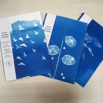 Sarah détourne une technique de photographie du 19è siècle : le cyanotype. Entre chambre noire et lumière du jour, elle capture l’instant présent en créant des mondes poétiques. Son objectif : mettre de la poésie dans votre quotidien ! Chaque image est unique, car elle dépend de la saison, de la lumière du jour, des nuages et du vent. Elle réalise des tableaux qu’elle encadre avec une technique traditionnelle d’encadrement. Sarah a à cœur de fabriquer ses produits de A à Z, de manière responsable : elle utilise du papier recyclé, limite l’usage du bois, choisit des colles contenant peu de solvants et préfère le verre recyclable au plexiglas. Sarah fabrique aussi des carnets cousus à la main et utilise une technique de reliure venue d’Égypte pour lier les pages et les couvertures.