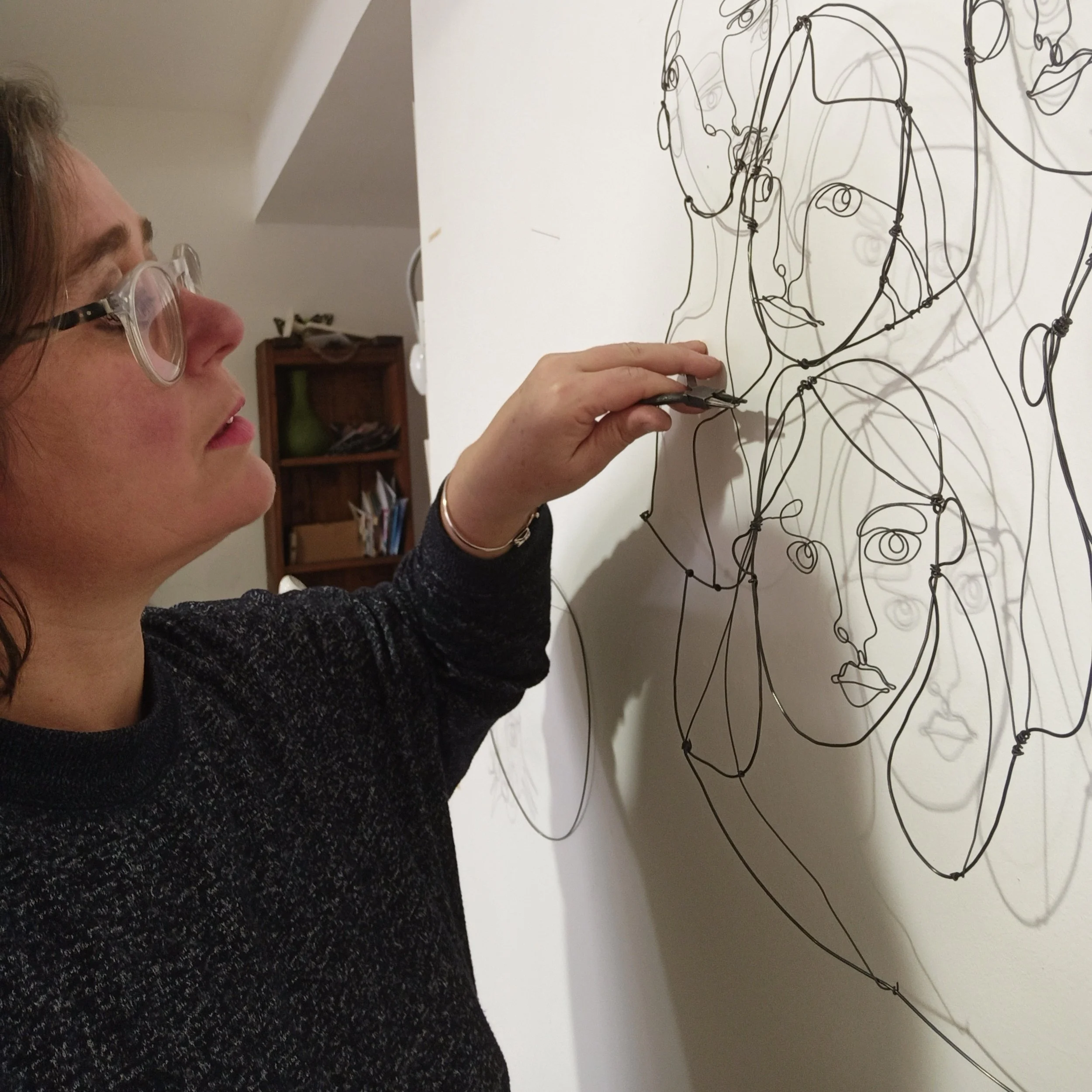 Poète-sculptrice, elle utilise le fil de fer comme moyen d’expression. Elle le lisse, l’arrondit, le sculpte pour en faire une phrase, une fleur, un visage, un insecte… Ses mains et ses pinces sont ses compagnes de travail.