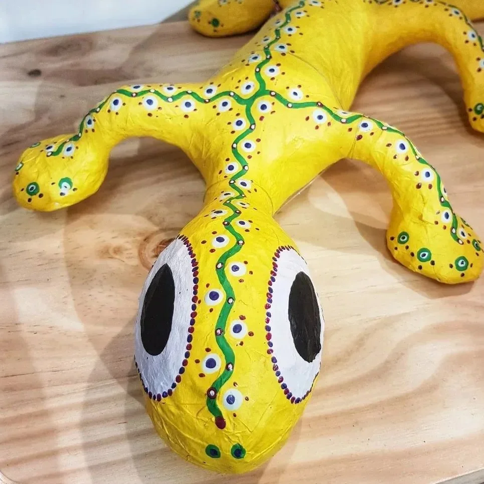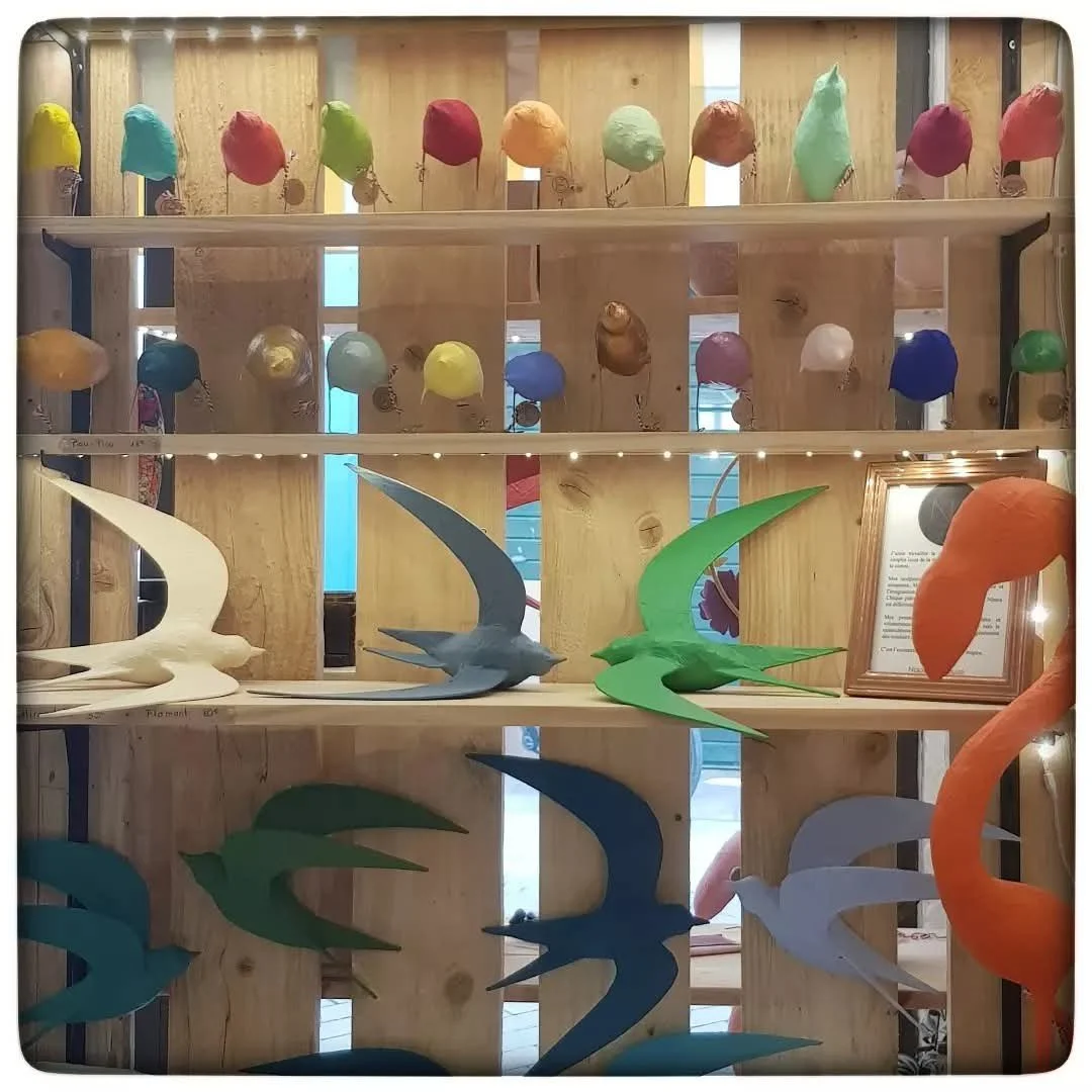 Elle dessine et découpe la plupart de pièces de bois (découpe laser). Elle les peint ensuite avec des peintures artisanales à base de pigments purs et de chaux qu’elle fabrique elle-même. Elle crée également son vernis artisanalement